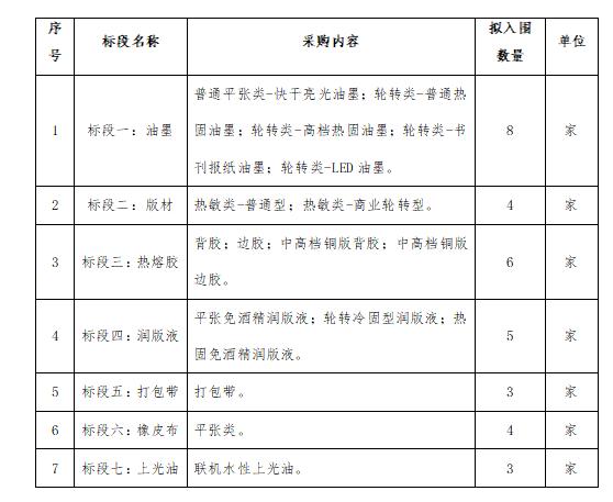 三、征集項目簡介:本項目征集人為中南出版?zhèn)髅郊瘓F(tuán)股份有限公司(以下簡稱“征集人”),湖南省印刷物資有限責(zé)任公司(以下簡稱“采購人”)根據(jù)征集結(jié)果實施采購,承擔(dān)框架協(xié)議和采購合同的簽訂與執(zhí)行。本次采購范圍為主要印刷輔料,涵蓋油墨、版材、熱熔膠、潤版液、打包帶、橡皮布、上光油七大類,劃分為7個標(biāo)段。若某標(biāo)段通過資格審查的供應(yīng)商數(shù)量小于擬入圍家數(shù),為保證項目競爭性,推薦入圍供應(yīng)商數(shù)量縮減為N-1,其中N是指通過資格符合性審查的供應(yīng)商的數(shù)量,征集人也有權(quán)針對該標(biāo)段重新組織采購。具體標(biāo)段劃分如下: