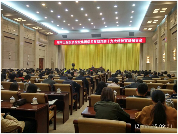 11月15日上午,湖南出版投資控股集團(tuán)學(xué)習(xí)貫徹黨的十九大精神宣講報(bào)告會在九所賓館會議中心舉行。黨的十九大代表、湖南新聞出版廣電局黨組書記朱建綱應(yīng)邀作輔導(dǎo)報(bào)告,集團(tuán)黨委書記、董事長,中南傳媒董事長龔曙光主持會議。集團(tuán)黨委領(lǐng)導(dǎo)、中南傳媒高管、子分公司全體集團(tuán)管理干部、控股集團(tuán)和中南傳媒總部員工共300余人參加會議。