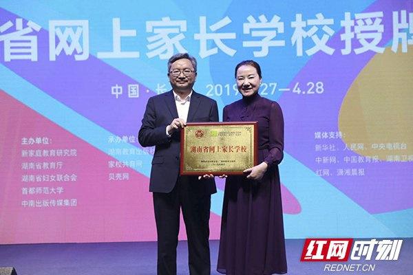 湖南省婦聯主席、黨委書記姜欣(右)向湖南教育出版社家校共育網授牌,成立“湖南省網上家長學校”。